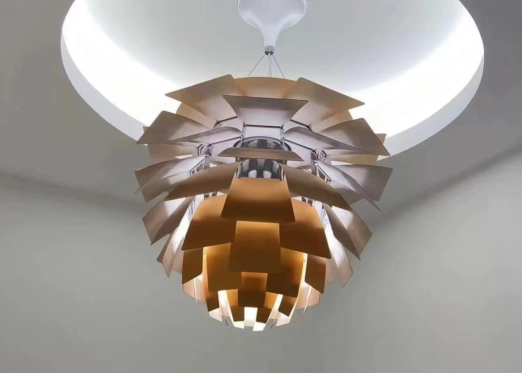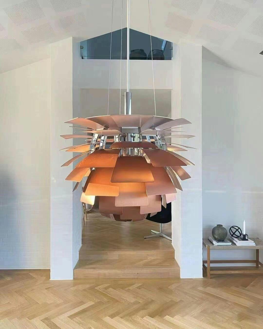 De lagdelte aluminiumselementer omslutter lyskilden og skaber et blødt, blændfrit 360° lys, der reflekteres smukt i rummet i stedet for at lyse direkte.