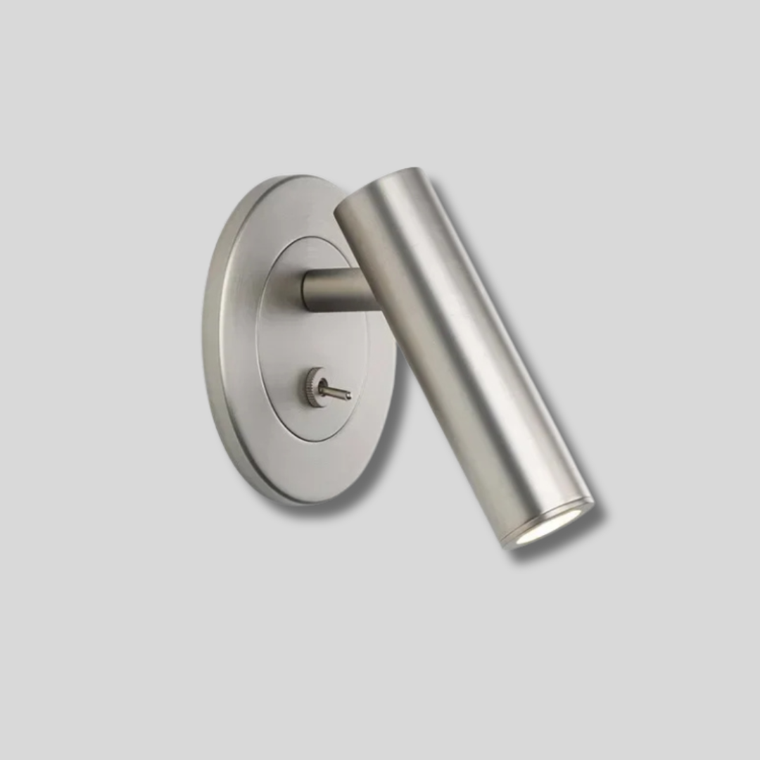 Med en børstet aluminiumsfinish og indbygget 3W LED-lys giver den et varmt, fokuseret skær – perfekt til læsning i sengen.