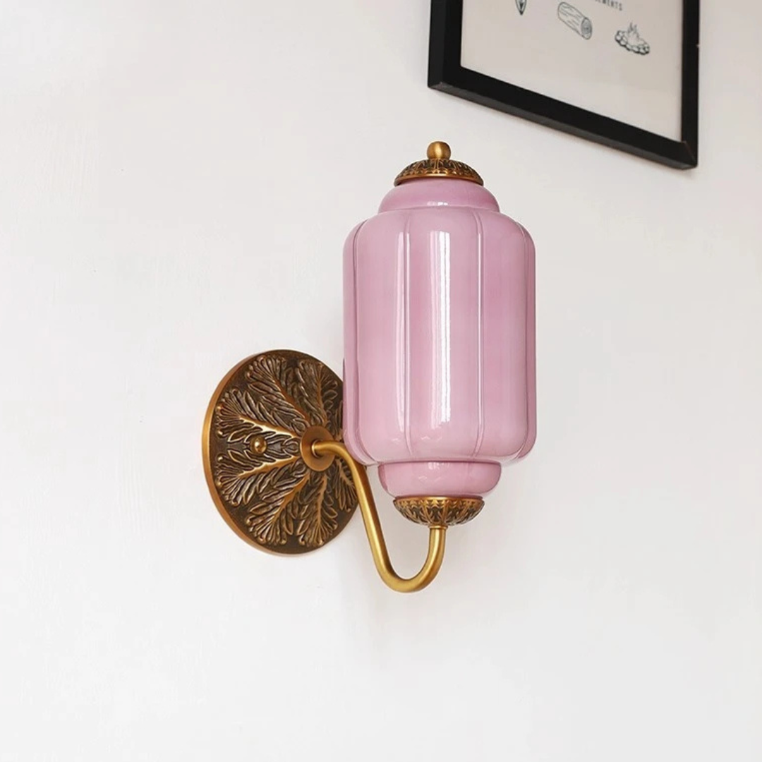 Den ribbede mælkehvide glasskærm kombineret med en antik messingfarvet vægmontering skaber et blødt, behageligt lys, der løfter stemningen i ethvert rum.